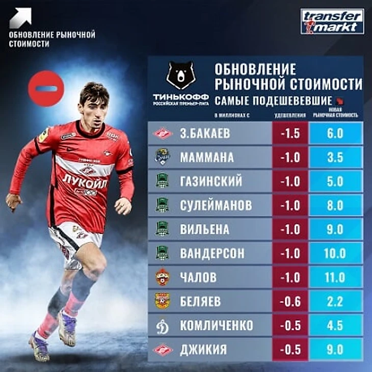 Cамым подешевевшим игроком лиги стал полузащитник «Спартака» Зелимхан Бакаев – его цена понизилась на 1,5 млн евро и составляет 6 млн евро.