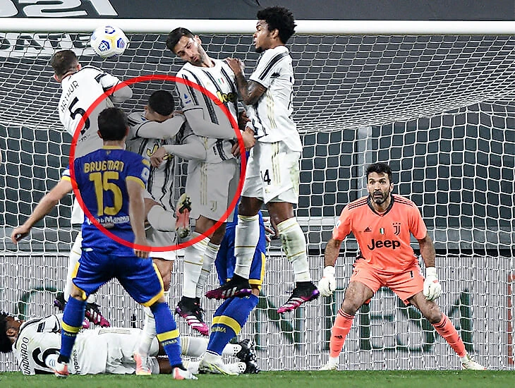 28-летний хавбек пробил над стенкой. Мяч пролетел над головой Криштиану Роналду, который был единственным игроком «Юве» в стенке, кто не выпрыгнул, он также закрыл лицо.