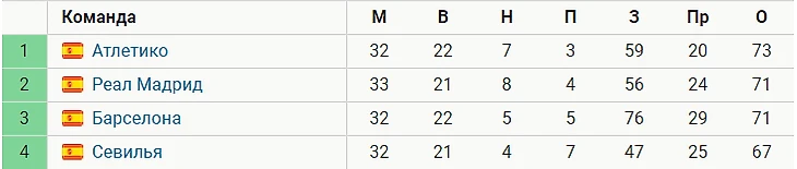 Четвертой в чемпионате идет «Севилья» – у нее 67 баллов после 32 матчей.