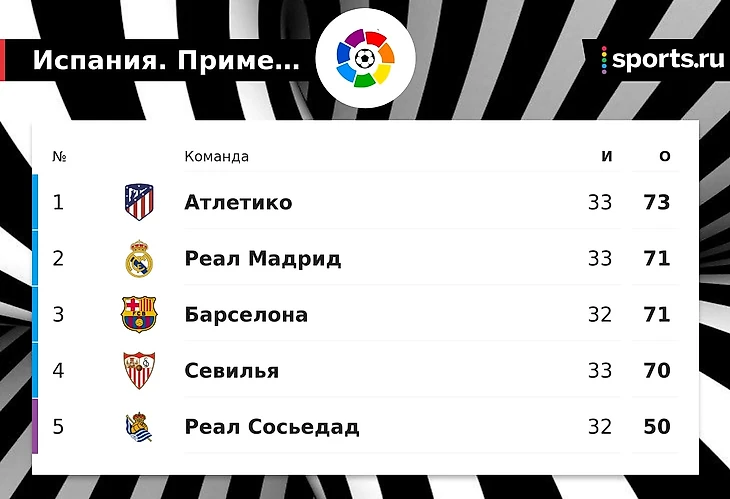 На втором месте идет «Реал» с 71 баллом. «Сливочные» опережают «Барселону», набравшую столько же очков, по дополнительным показателям, но у каталонцев есть матч в запасе.