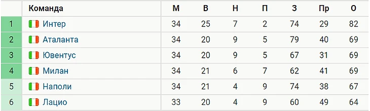 После 34 игр «Ювентус» расположился на 3-й строчке в таблице чемпионата, набрав 69 очков. Столько же баллов у «Аталанты», занимающей второе место, и «Милана», идущего четвертым. «Наполи» с 67 баллами идет пятым.