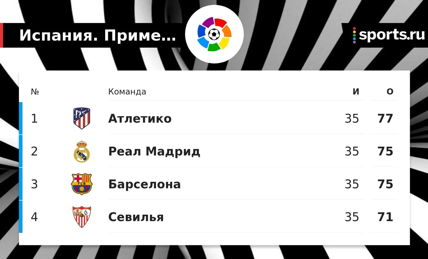 У занимающей третью позицию «Барселоны» также 75 баллов, «Севилья» расположилась на четвертой строчке с 71 очком.