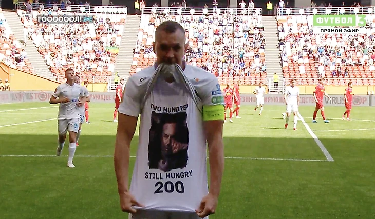Кроме того, Дзюба показал футболку с надписью на английском: «Две сотни – все еще голоден». На футболке также был постер фильма «Никто», снятого в Голливуде Ильей Найшуллером.
