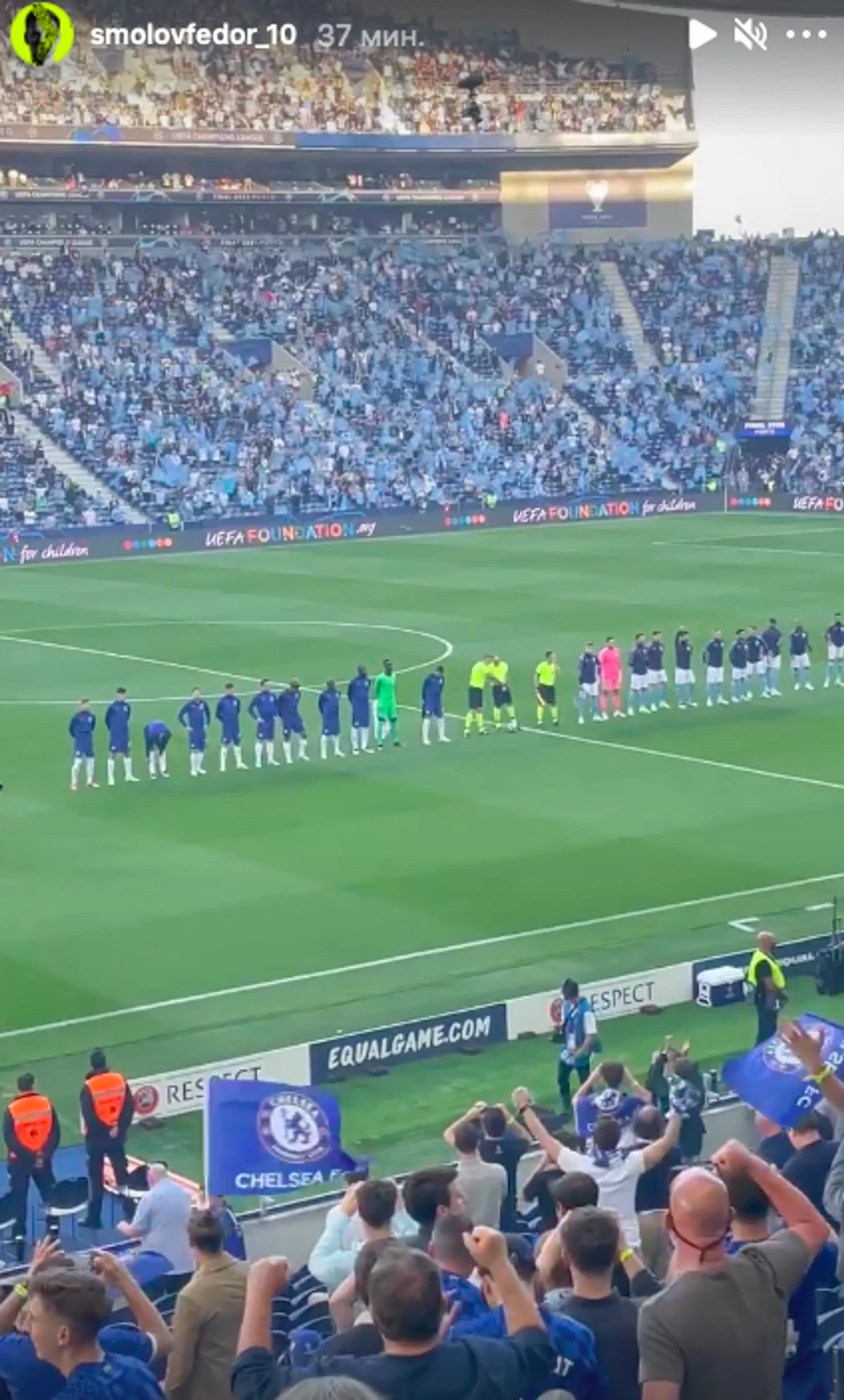 Нападающий «Локомотива» Федор Смолов посетил финал Лиги чемпионов, где «Манчестер Сити» играет с «Челси» (0:0, первый тайм).