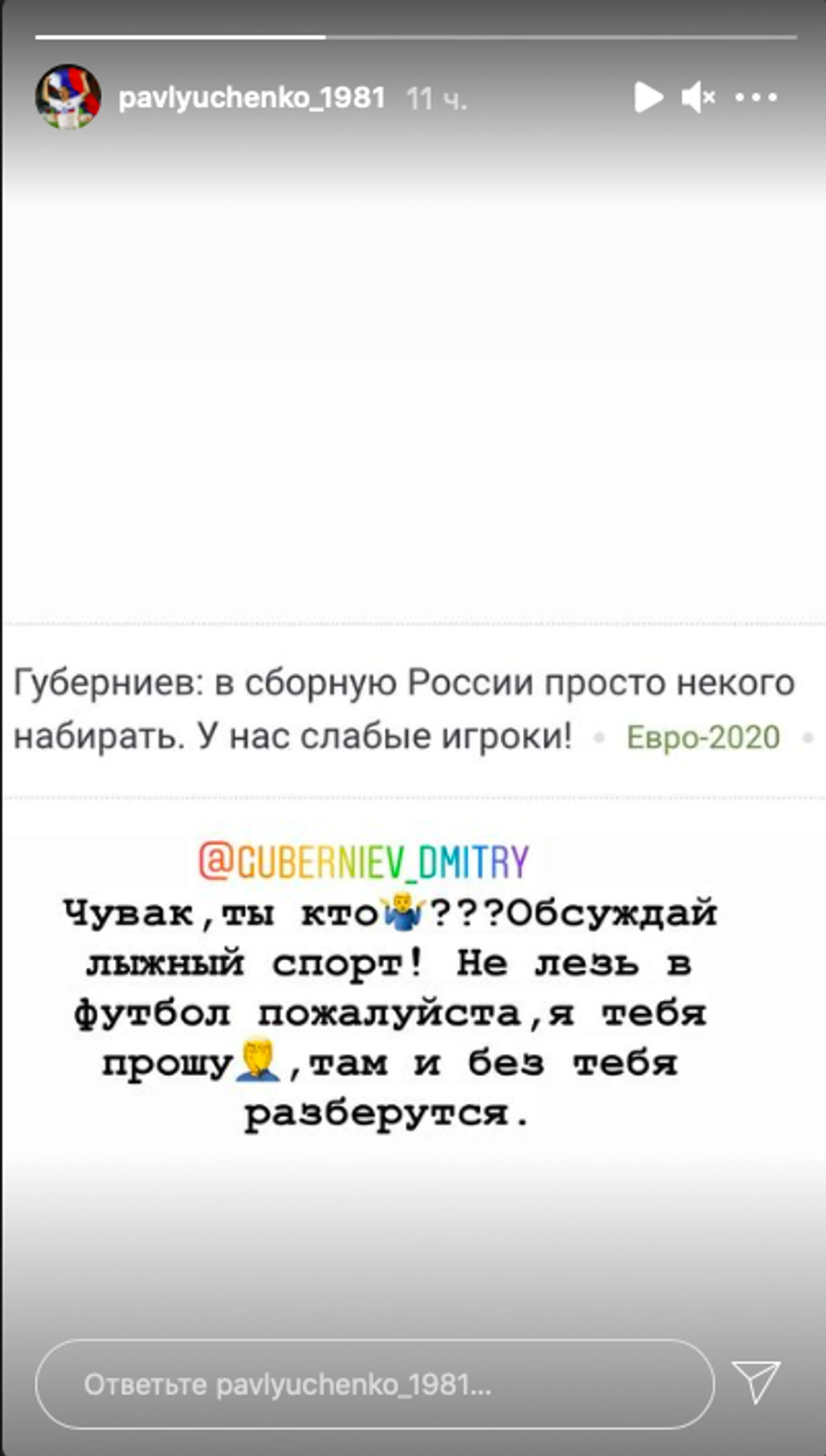 «Чувак, ты кто? Обсуждай лыжный спорт! Не лезь в футбол, пожалуйста, я тебя прошу. Там и без тебя разберутся», – написал Павлюченко в сторис инстаграма, комментируя слова Губерниева.