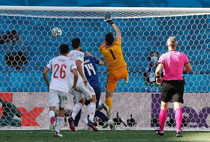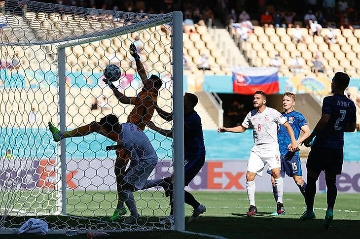 На 30-й минуте полузащитник испанцев Пабло Сарабия попал в перекладину ворот Словакии. Мяч отскочил вертикально вверх, и голкипер Мартин Дубравка, пытаясь его выбить, рукой отправил в сетку собственных ворот.
