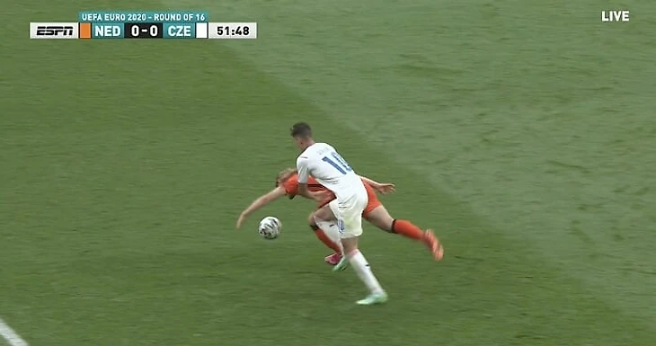 На 52-й минуте нидерландский защитник Маттейс де Лигт в борьбе с форвардом Патриком Шиком поскользнулся и, падая, рукой откинул мяч.