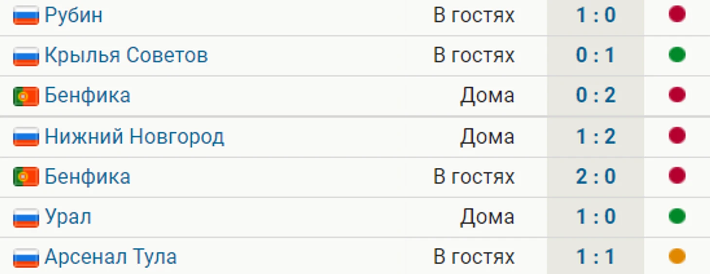 Еще четыре матча завершились поражениями – двумя от «Бенфики» в Лиге чемпионов, по одному – от «Рубина» и «Нижнего Новгорода».