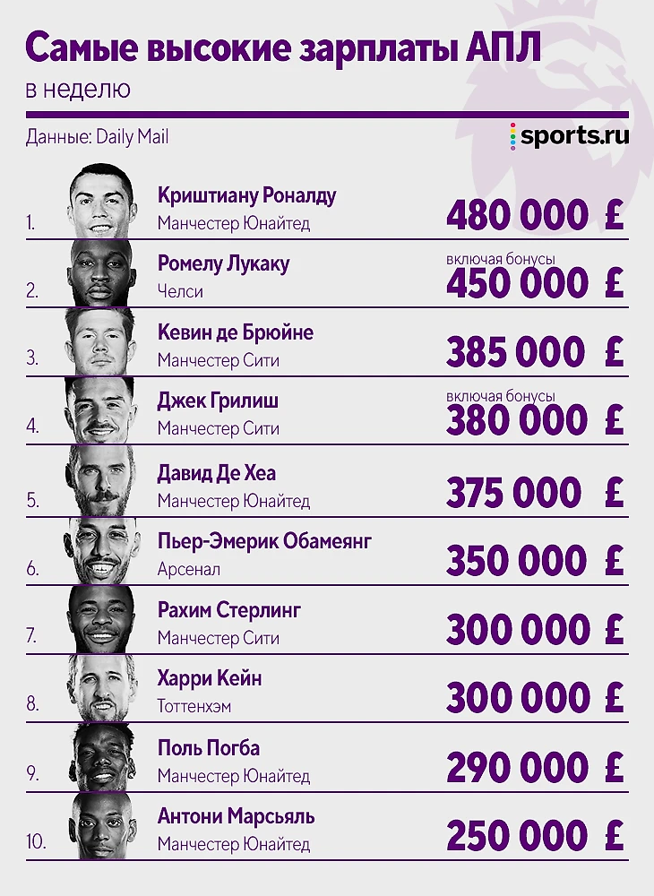 В топ-3 по зарплате в Премьер-лиге также входят новичок «Челси» Ромелу Лукаку (450 тысяч фунтов в неделю с бонусами) и Кевин де Брюйне из «Ман Сити» (385 тысяч).