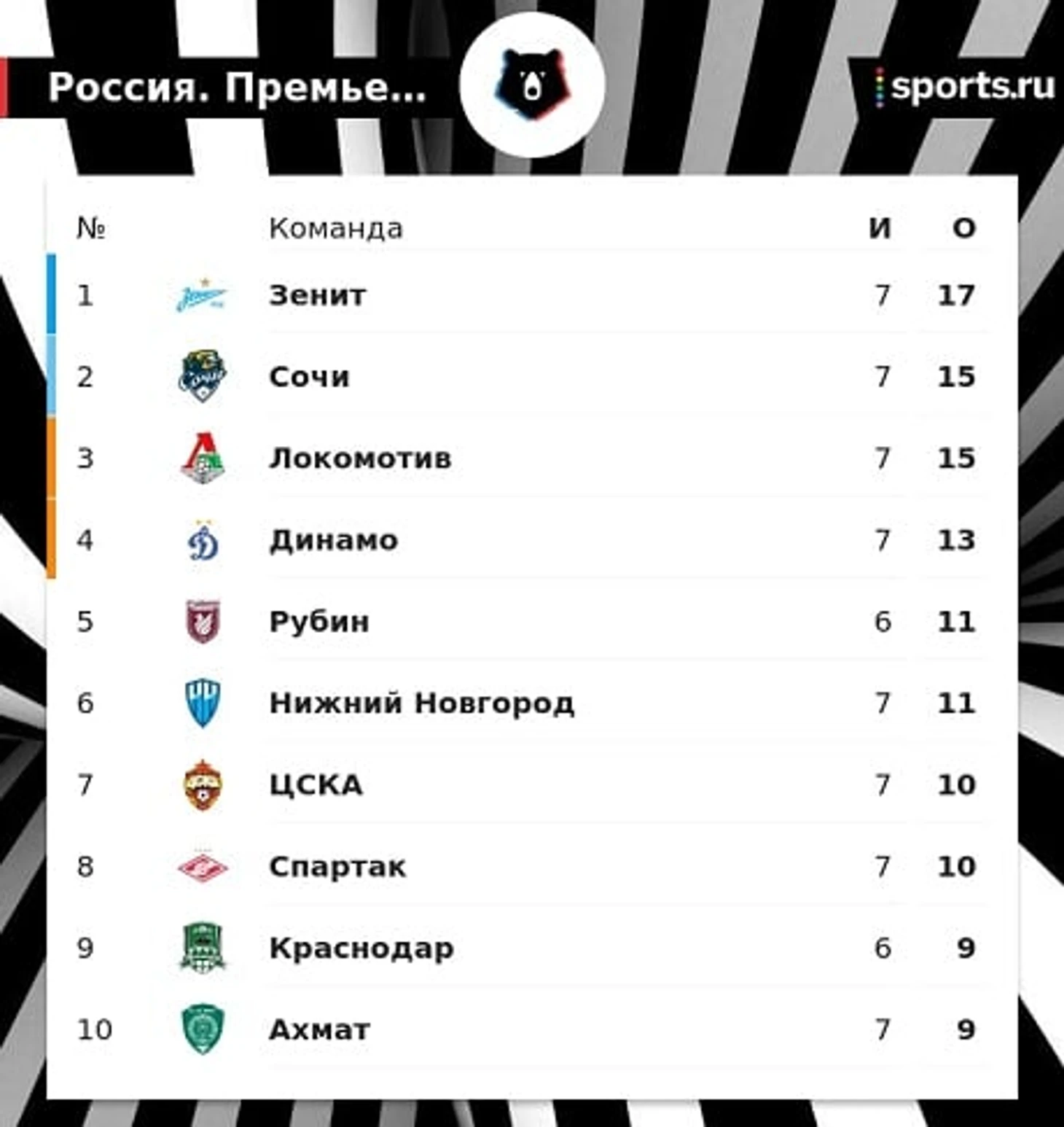 «Зенит» лидирует в РПЛ после 7 туров, «Сочи» и «Локо» отстают на 2 очка, «Динамо» – на 4, «Спартак» – на 7