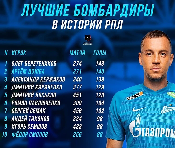 Он вышел на чистое второе место в списке лучших бомбардиров в истории лиги, опередив экс-нападающего «Зенита» Александра Кержакова (139 голов за 340 матчей).