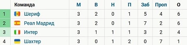«Реал» идет вторым, также набрав 6 очков. Третью позицию занимает «Интер» с 4 очками. На последнем месте идет «Шахтер», набравший 1 очко.