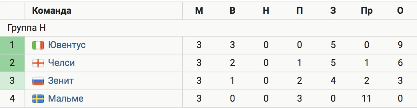 Лидирует с девятью очками «Ювентус», одержавший три победы в трех матчах. Второе место занимает «Челси» (шесть очков), «Мальме», не набравший ни одного балла, идет последним.