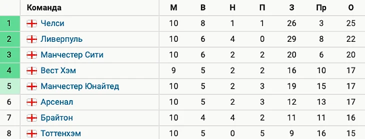 «Челси» лидирует в АПЛ c 25 очками, «Ливерпуль» – 2-й c 22 баллами, «Ман Сити» – 3-й, «МЮ» – 5-й, «Арсенал» – 6-й