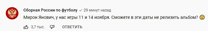 «Мирон Янович, у нас игры 11 и 14 ноября. Сможете в эти даты не релизить альбом? 😉» – написала сборная в комментариях под видео с новым треком «Цунами».