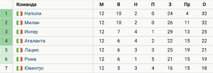 «Интер» с 25 очками занимает 3-е место, «Аталанта» (22 балла) идет 4-й. У «Ювентуса» 18 очков.