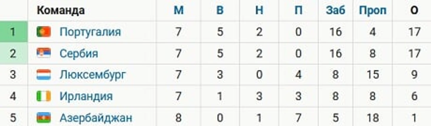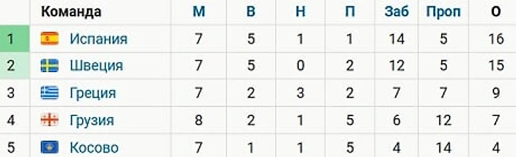 Сборная Португалии после матчей занимает 1-е место в группе A с 17 очками, опережая Сербию по разнице голов. А Испания лидирует в группе B, набрав 16 очков – на балл больше Швеции.