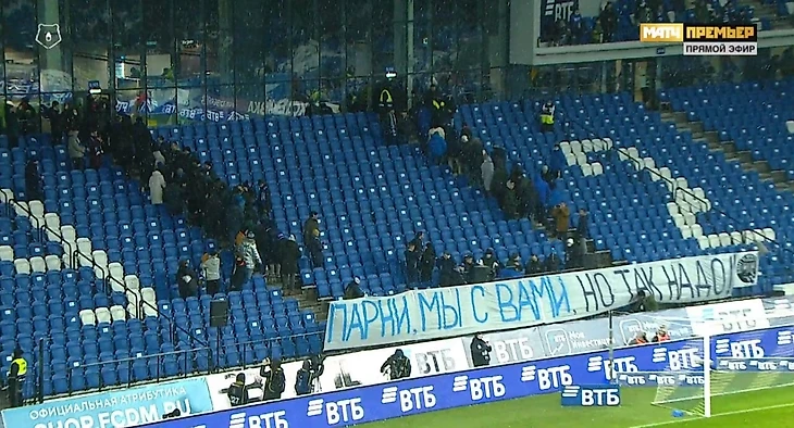Болельщики покинули сектор перед началом второго тайма, но оставили баннер: «Парни, мы с вами, но так надо!»