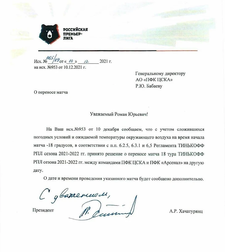 Конов также прикрепил скан письма главы РПЛ Ашота Хачатурянца, адресованный гендиректору ЦСКА Роману Бабаеву в ответ на запрос. Там сказано, что во время матча ожидается температура -18 градусов, в связи с чем и принято решение о переносе.