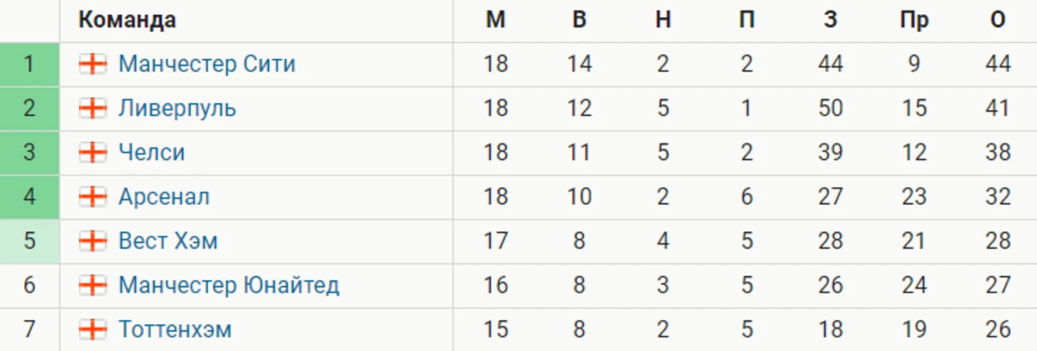 «Ман Сити» опережает «Ливерпуль» на 3 очка после 18 туров АПЛ. «Челси» отстает от «горожан» на 6