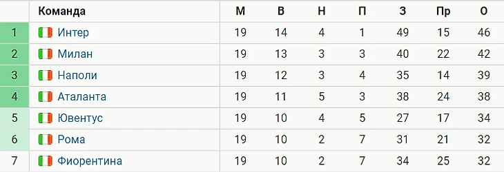 «Интер» закончил первый круг во главе таблицы – на его счету 46 очков. Команда Симоне Индзаги опережает «Милан», идущий вторым, на 4 балла.
