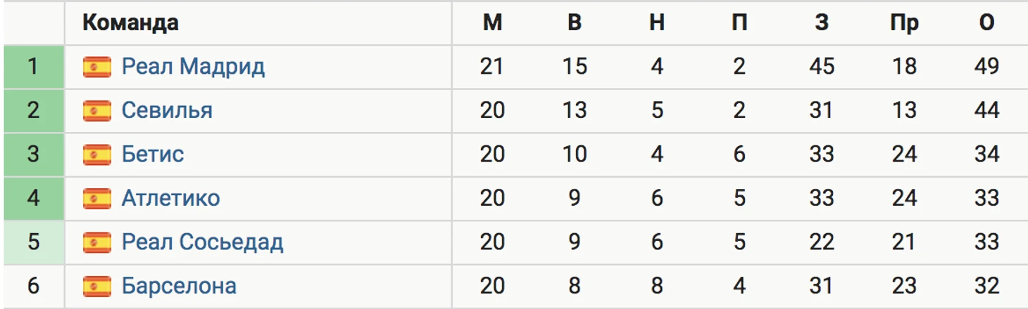 «Реал» лидирует с 49 очками после 21 матча. У «Севильи» 44 балла, «Бетис» набрал 34 балла, «Атлетико» и «Реал Сосьедад» – по 33, «Барса» – 32. Все преследователи «Мадрида» провели по 20 игр.