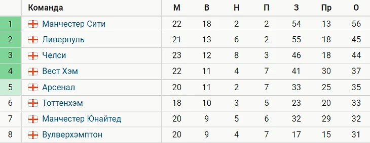 У лидирующего «Ман Сити» – 56 баллов за 22 игры, у идущего вторым «Ливерпуля» – 45 очков за 21 матч.