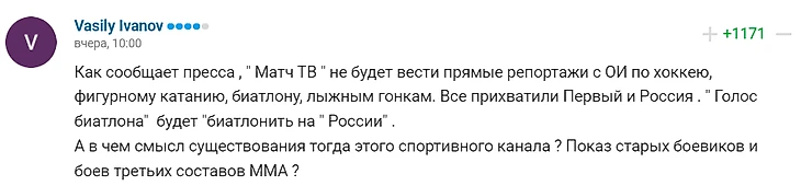 Победителем стал пользователь Vasily Ivanov, оставивший следующий комментарий: «Как сообщает пресса, «Матч ТВ» не будет вести прямые репортажи с ОИ по хоккею, фигурному катанию, биатлону, лыжным гонкам. Все прихватили Первый и Россия. «Голос биатлона» будет «биатлонить на «России». А в чем смысл существования тогда этого спортивного канала? Показ старых боевиков и боев третьих составов ММА?»