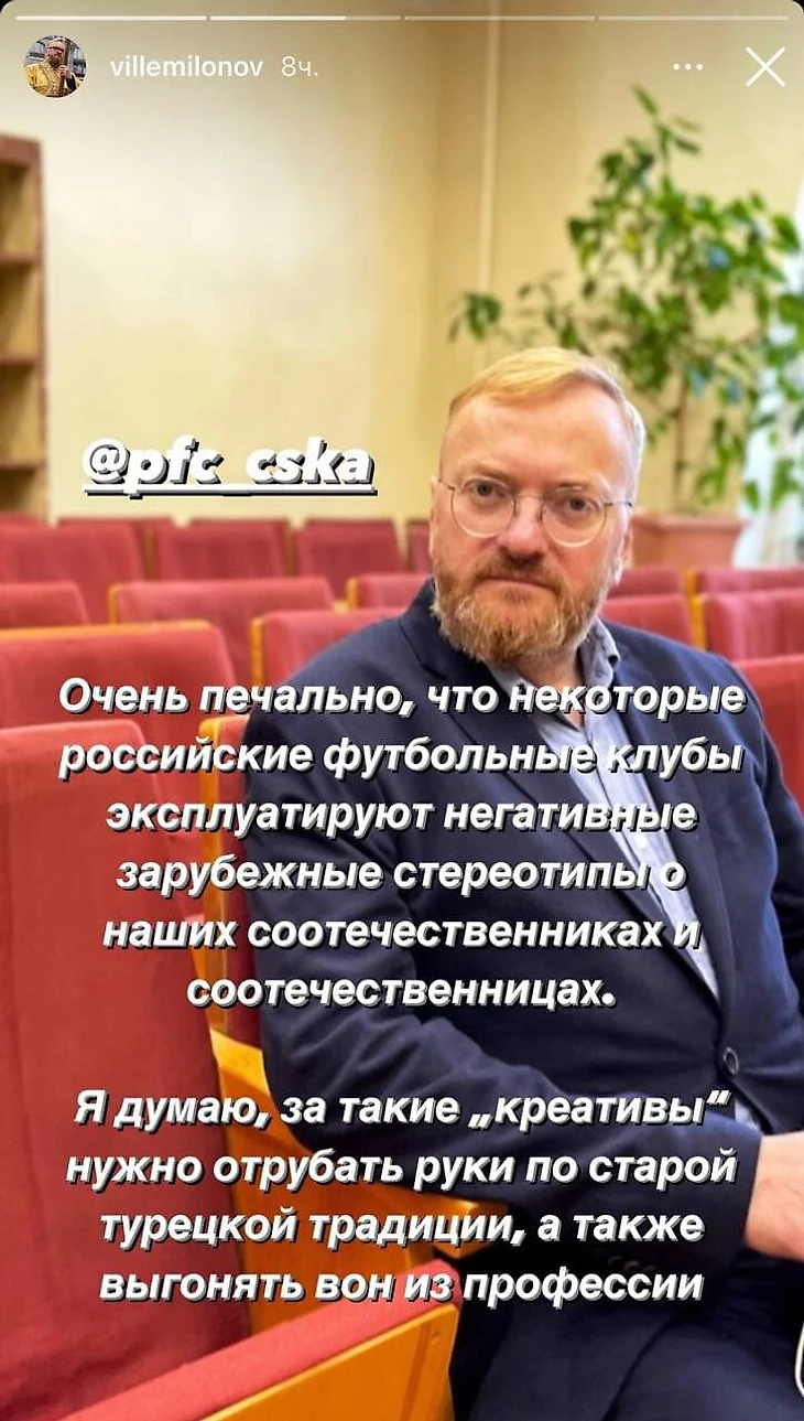Милонов о видео ЦСКА про Наташ: «Руки нужно отрубать за такие «креативы» и выгонять из профессии»