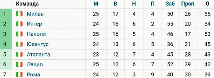 • «Милан» возглавил таблицу Серии А после 25 туров. У «Интера» на очко меньше и матч в запасе