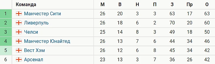 «Манчестер Сити», лидирующий в таблице, за 26 матчей набрал 63 балла.