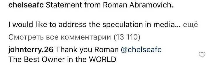 «Спасибо, Роман. Лучший владелец в мире», – написал экс-защитник лондонского клуба в комментариях к заявлению бизнесмена.