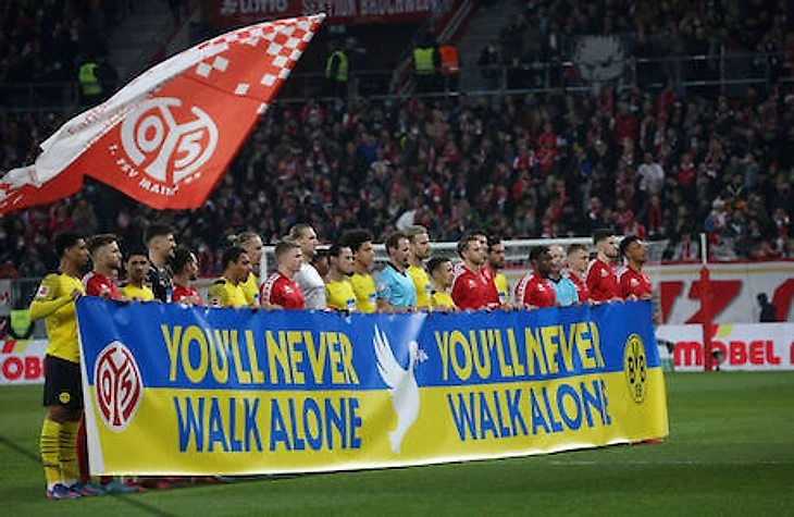 • Игроки «Боруссии» и «Майнца» показали плакат You’ll never walk alone в цветах флага Украины перед игрой