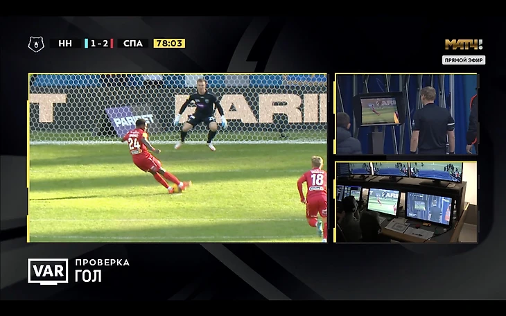Главный арбитр матча Сергей Иванов обратился к ВАР, посмотрел повтор эпизода и отменил гол, назначив свободный удар в пользу «Нижнего».