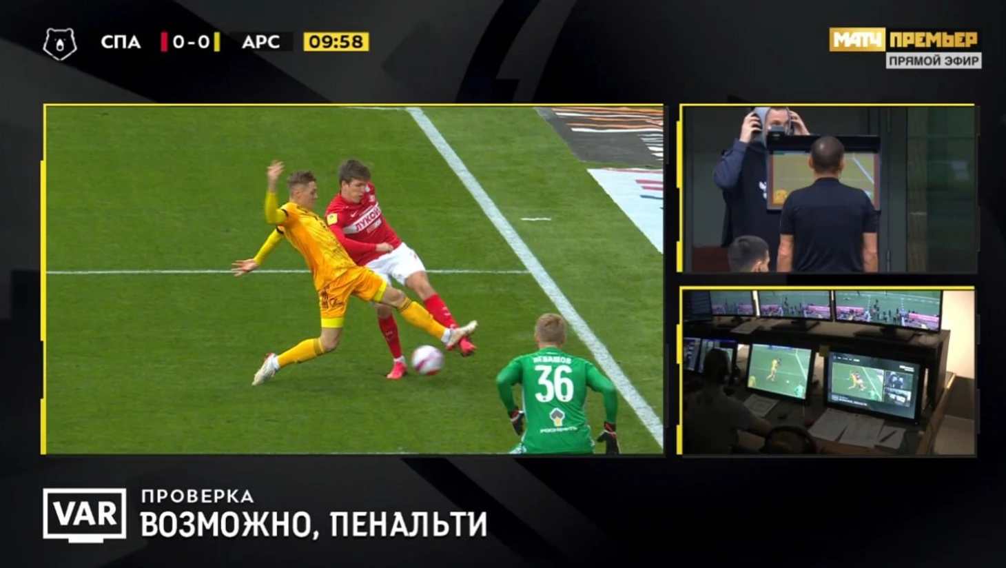 Главный арбитр не усмотрел повода дать «Спартаку» пробить пенальти, однако после разговора с ВАР отправился смотреть видеоповтор. В итоге одиннадцатиметровый назначен все же не был.