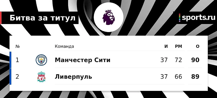 В 37-м туре команда Юргена Клоппа обыграла «Саутгемптон» (2:1) и сократила отставание от «горожан», сыгравших вничью с «Вест Хэмом» (2:2), до одного балла – у «Сити» 90 очков, у «Ливерпуля» – 89.