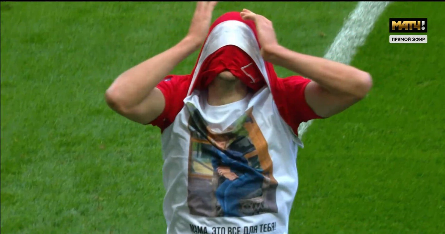 Празднуя гол, Соболев продемонстрировал майку с надписью «Мама, это все для тебя!» и фотографией. Игровую футболку он натянул на лицо, скрывая слезы.