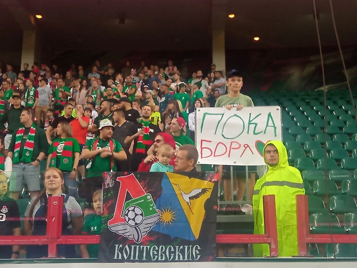Также один из болельщиков держал на трибуне плакат «Пока, Боря», передает корреспондент Sports.ru Ярослав Сусов.