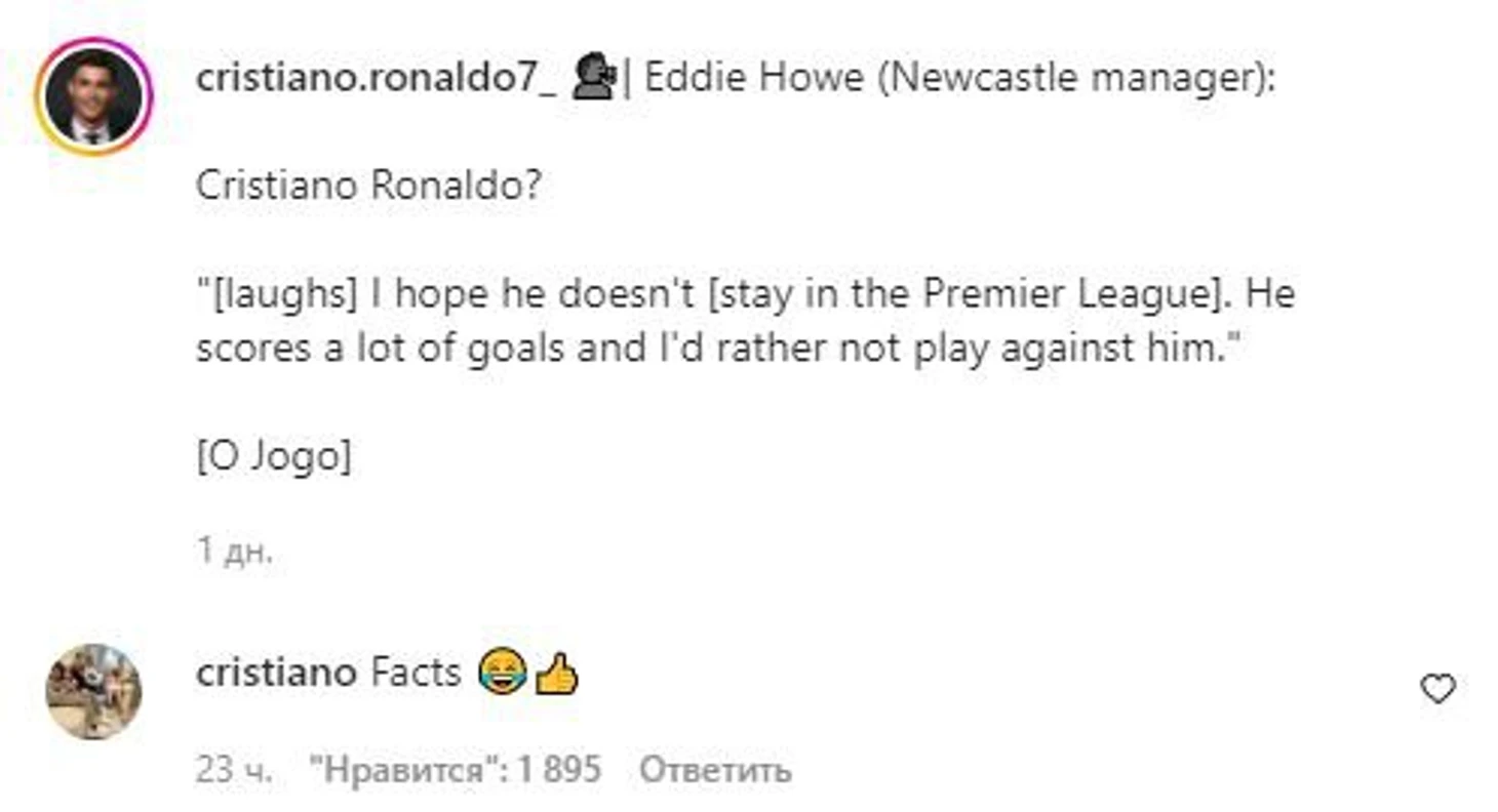 «Факты 😂👍», – написал Роналду в комментариях к этой цитате в инстаграме.