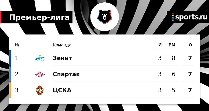 «Зенит», «Спартак» и ЦСКА лидируют в Мир РПЛ с 7 очками. Петербужцы идут первыми благодаря разнице голов