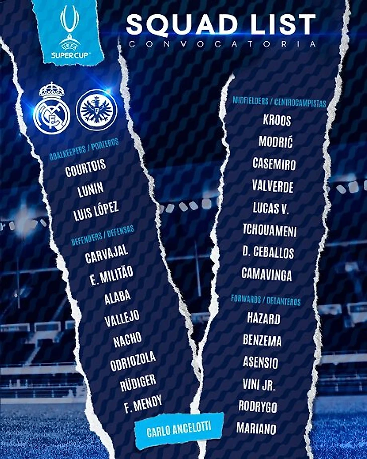 Главный тренер мадридцев Карло Анчелотти включил в заявку на игру 25 футболистов, в том числе новичков клуба – защитника Антонио Рюдигера и хавбека Орельена Тчуамени.