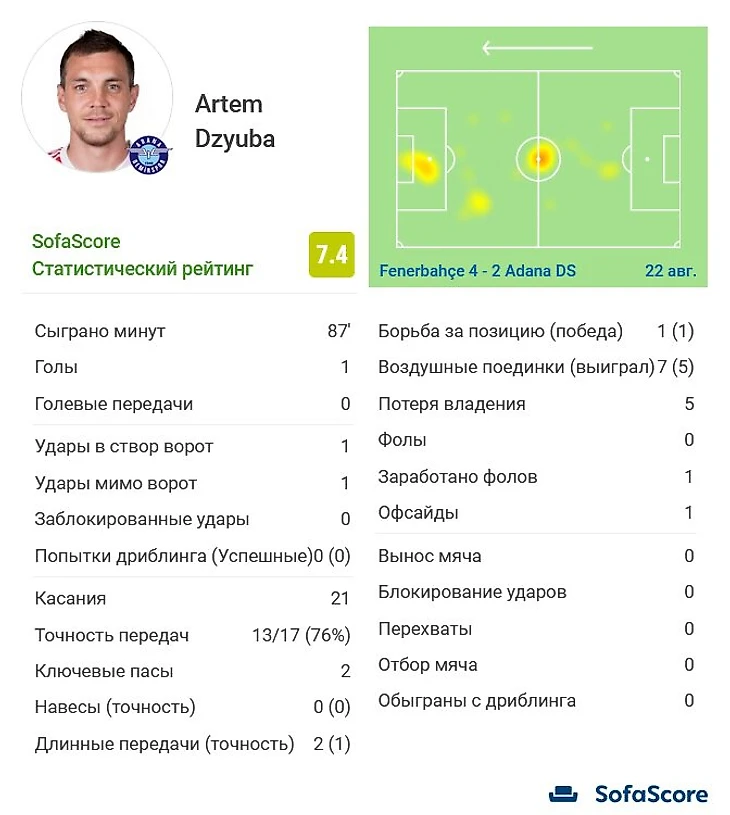 Дебют Дзюбы за «Адана Демирспор»: гол, 21 касание за 87 минут, 76% точных передач, 5 успешных верховых дуэлей из 7