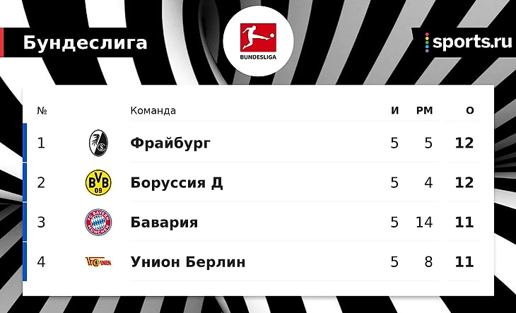 У «Фрайбурга» 12 баллов и первое место. У «Боруссии» из Дортмунда тоже 12 очков, но они уступают по дополнительным показателям.
