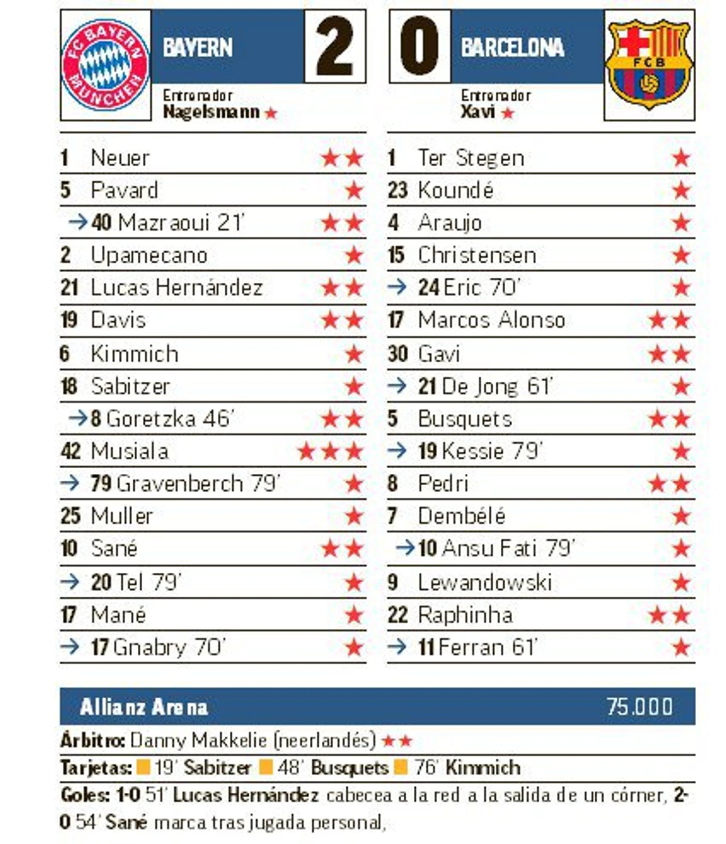 У «Баварии» три звезды получил хавбек Джамал Мусиала, отдавший голевой пас. По одной звезде получили 9 футболистов и главный тренер мюнхенцев Юлиан Нагельсманн.