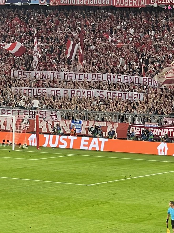 На матче с «Барселоной» в Лиге чемпионов (2:0) фанаты мюнхенского клуба вывесили баннер: «Матчи переносят в последний миг из-за смерти монарха?! Уважайте фанатов!»
