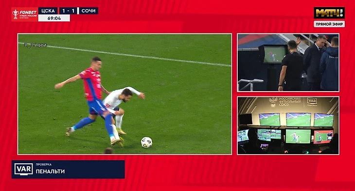 На 68-й минуте матча 3-го тура Фонбет Кубка России главный арбитр Алексей Сухой назначил 11-метровый удар в пользу сочинцев после контакта Виллиана Роши и Владислава Сарвели в штрафной площади армейцев.
