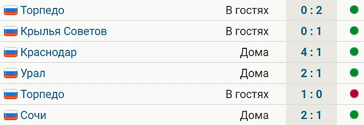 Команда Владимира Федотова начиная с 31 августа уступила «Торпедо» в Мир РПЛ, но обыграла его в Кубке, а также выиграла у «Крыльев Советов», «Краснодара» и «Урала».