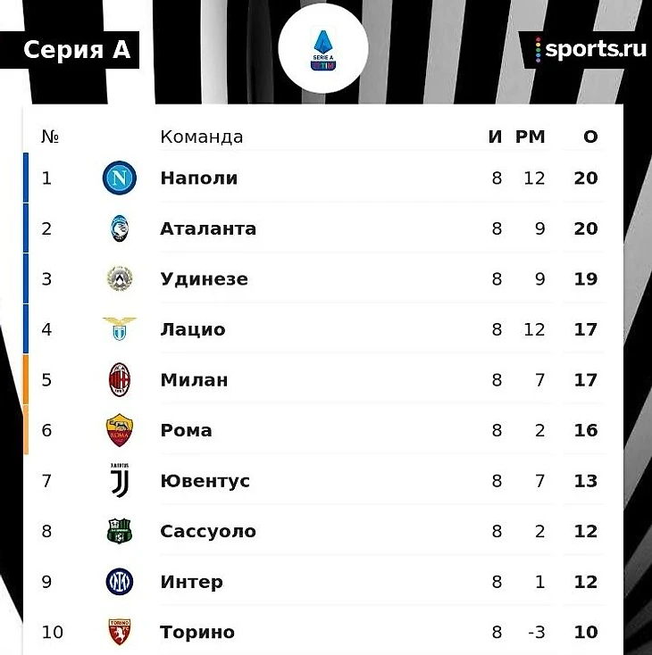 «Лацио» и «Милан» с 17 очками делят 4-е место, «Рома» с 16 очками идет на 6-м месте, «Ювентус» с 13 очками – на 7-м.