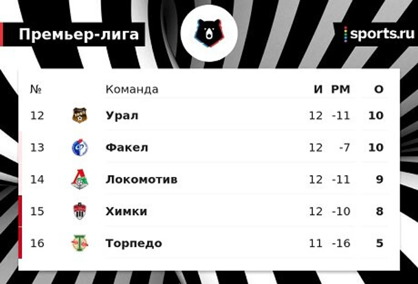 «Локо» занимает 14-е место, ниже располагаются «Химки» (8 очков) и «Торпедо» (5 очков + матч в запасе).
