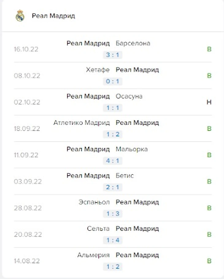 Осенью «сливочные» не проигрывают. В 10-ти крайних встречах 8 побед и 2 ничьи. Разница голов 21:7. В 7 встречах отличились обе команды. На выезде у «Реала» 7 побед, 2 ничьи и 1 поражение. Единственное поражение в майском дерби с «Атлетико». После серия из 9 игр без поражений. В 7 гостевых встречах «Реал» пропустил. Результаты «Реала» в Примере 2022/2023.